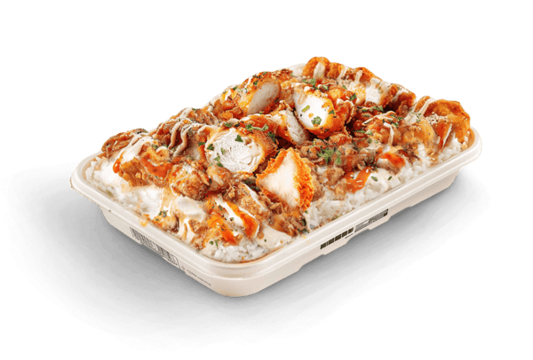 Poulet crousty maison (100% filet), riz. Sauces Blanche et Thaï, oignons croquants.